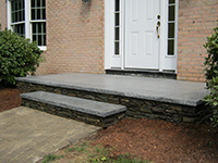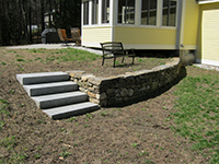 Landscape steps, also called steps-in-grade are built on a gravel footing laid into the grade. Solid granite steps are stacked and pinned in place together to avoid shifting during winter frosts. Natural stone steps are typically dry stacked.
